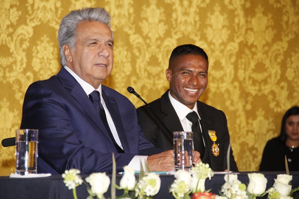 Este martes 14 de mayo en el Palacio de Carondelet, el futbolista ecuatoriano Antonio Valencia fue condecorado con la Orden Nacional al Mérito en grado de oficial por el presidente de la República Lenín Moreno.