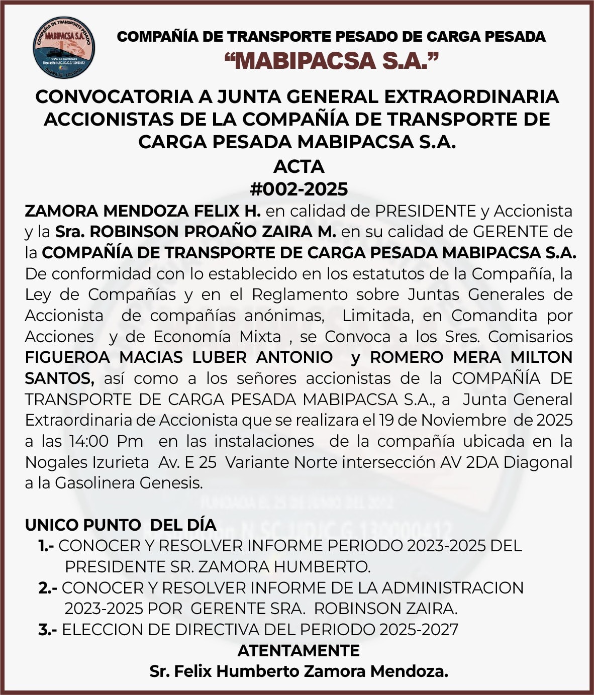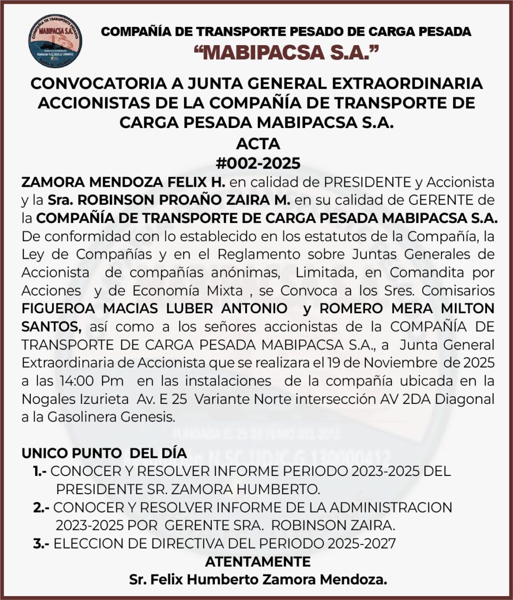 CONVOCATORIA A JUNTA GENERAL EXTRAORDINARIA DE ACCIONISTAS DE LA COMPAÑIA DE TRANSPORTE DE CARGA PESADA MABIPACSA S.A. por: ALDIA 10/11/2025 FacebookTwitterWhatsApp Unirme al canal de whatsapp de noticias ALDIA FacebookTwitterWhatsApp Te recomendamos Convocatorias FLOTA DE TRANSPORTE ESCOLAR E INSTITUCIONAL MUNDO MÓVIL – CONVOCATORIA A JUNTA GENERAL EXTRAORDINARIA ALDIA - 07/08/2025 Convocatorias Concurso Público Nacional e Internacional del sistema de agua potable del cantón Ventanas Los Ríos – Ecuador ALDIA - 04/08/2025 Convocatorias CONVOCATORIA PUBLICA ALDIA - 25/06/2025 - Advertisment - LO ÚLTIMO Grave incidente en sepelio de Baba: Menor de edad resulta herida de bala 11/11/2025 Tragedia en Quevedo: Fallece niño de 9 años tras impacto de bala en la mandíbula 11/11/2025 Ecuatorianos viven una semana decisiva de cara al referéndum dispuesto por el presidente Daniel Noboa 11/11/2025 Jorge Glas fue trasladado a la cárcel del Encuentro, de máxima seguridad en Santa Elena 11/11/2025 Cargar más ÙLTIMAS NOTICIAS Ecuador Ecuador anuncia financiamiento de $250 millones del BID para fortalecer el sistema de salud ALDIA - 06/11/2025 Ecuador CNE designa y capacita a 3.345 miembros de Juntas Receptoras del Voto para el referéndum y Consulta Popular 2025 en el exterior 22/10/2025 Ecuador Alcaldías de Imbabura urgen al Gobierno y a indígenas a retomar el diálogo y evitar la confrontación 22/10/2025