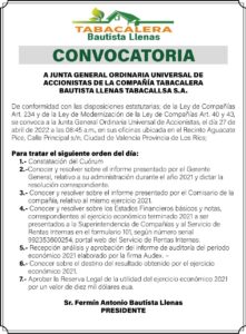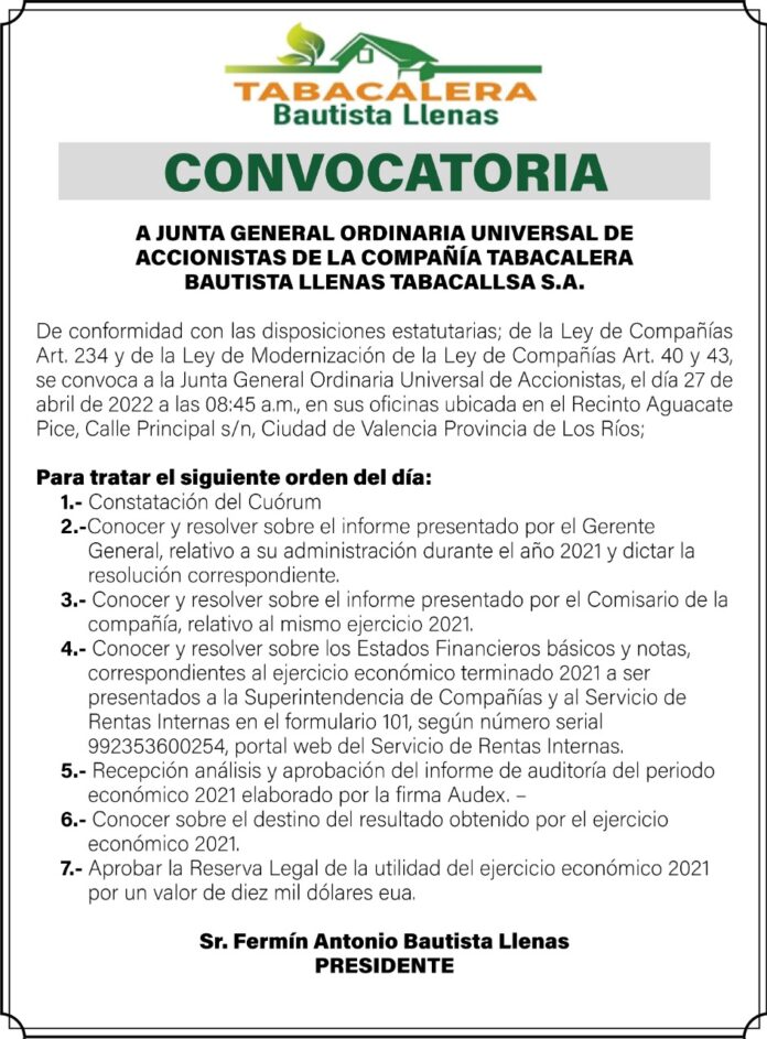 Convocatoria a Junta General Ordinaria de Accionistas – TABACALLSA S.A. 22/04/2022 Únete a nuestro canal FacebookInstagramTikTokTwitterWhatsApp Convocatorias Lo último Quevedo Clínica Móvil del GAD-Quevedo lleva salud preventiva al Sector Juan de Dios Avilés Zárate Los Ríos Ecuador concreta la primera exportación de plátano con Sello AFC hacia Chile Los Ríos Prefectura de Los Ríos celebró la Navidad a 800 adultos mayores en la UTEQ Crónica Fiscalía de Los Ríos allanada por presunta filtración de datos a red de sicariato Suscribirte - Obtenga acceso completo a nuestro contenido premium - No te pierdas ninguna historia con las notificaciones. SuscribirmeHe leído y acepto la Política de Privacidad. - Browse free from up to 5 devices at once