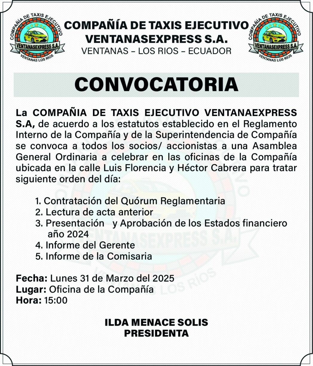 CONVOCATORIA – COMPAÑIA DE TAXIS EJECUTIVO VENTANASEXPRESS S.A por: ALDIA 17/03/2025 FacebookTwitterWhatsApp Unirme al canal de whatsapp de noticias ALDIA FacebookTwitterWhatsApp Te recomendamos Convocatorias FLOTA DE TRANSPORTE ESCOLAR E INSTITUCIONAL MUNDO MÓVIL – CONVOCATORIA A JUNTA GENERAL EXTRAORDINARIA ALDIA - 07/08/2025 Convocatorias Concurso Público Nacional e Internacional del sistema de agua potable del cantón Ventanas Los Ríos – Ecuador ALDIA - 04/08/2025 Convocatorias CONVOCATORIA PUBLICA ALDIA - 25/06/2025 - Advertisment - LO ÚLTIMO Taxistas de Babahoyo se llenan de temor, tres unidades son incineradas, sucede cada 24 horas 26/10/2025 Joven es abatido cuando observaba un partido en Babahoyo, otra persona resultó herida 26/10/2025 IESS Tarira celebró 38 años a la comunidad rural de Los Ríos 26/10/2025 Cuatro personas fueron abatidas en el cantón Buena Fe 26/10/2025 Cargar más ÙLTIMAS NOTICIAS Ecuador CNE designa y capacita a 3.345 miembros de Juntas Receptoras del Voto para el referéndum y Consulta Popular 2025 en el exterior ALDIA - 22/10/2025 Ecuador Alcaldías de Imbabura urgen al Gobierno y a indígenas a retomar el diálogo y evitar la confrontación 22/10/2025 Ecuador AME exige pago inmediato de deuda ante imposibilidad de cumplir con pago anticipado del décimo tercer sueldo 06/10/2025