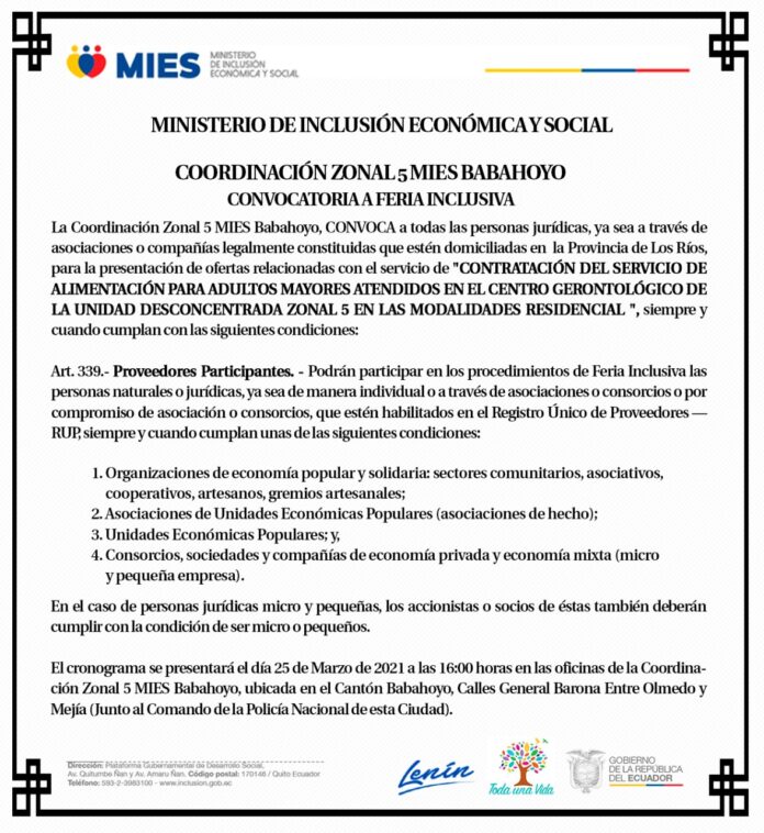 Convocatoria MIES Babahoyo, contratación Feria Inclusiva por: ALDIA 13/03/2021 FacebookTwitterWhatsApp Unirme al canal de whatsapp de noticias ALDIA FacebookTwitterWhatsApp Te recomendamos Convocatorias FLOTA DE TRANSPORTE ESCOLAR E INSTITUCIONAL MUNDO MÓVIL – CONVOCATORIA A JUNTA GENERAL EXTRAORDINARIA ALDIA - 07/08/2025 Convocatorias Concurso Público Nacional e Internacional del sistema de agua potable del cantón Ventanas Los Ríos – Ecuador ALDIA - 04/08/2025 Convocatorias CONVOCATORIA PUBLICA ALDIA - 25/06/2025 - Advertisment - LO ÚLTIMO Asambleísta Rosa Torres entrega kits educativos y materiales en Buena Fe y Valencia 03/11/2025 Bomba estalla en cooperativa de taxis en Babahoyo tras negar pagar extorsión 03/11/2025 Ecuador muestra crecimiento económico en octubre a pesar del paro, según Noboa 03/11/2025 ¿Vandalismo o accidente? Contenedor recién instalado aparece destruido en Quevedo 03/11/2025 Cargar más ÙLTIMAS NOTICIAS Ecuador CNE designa y capacita a 3.345 miembros de Juntas Receptoras del Voto para el referéndum y Consulta Popular 2025 en el exterior ALDIA - 22/10/2025 Ecuador Alcaldías de Imbabura urgen al Gobierno y a indígenas a retomar el diálogo y evitar la confrontación 22/10/2025 Ecuador AME exige pago inmediato de deuda ante imposibilidad de cumplir con pago anticipado del décimo tercer sueldo 06/10/2025