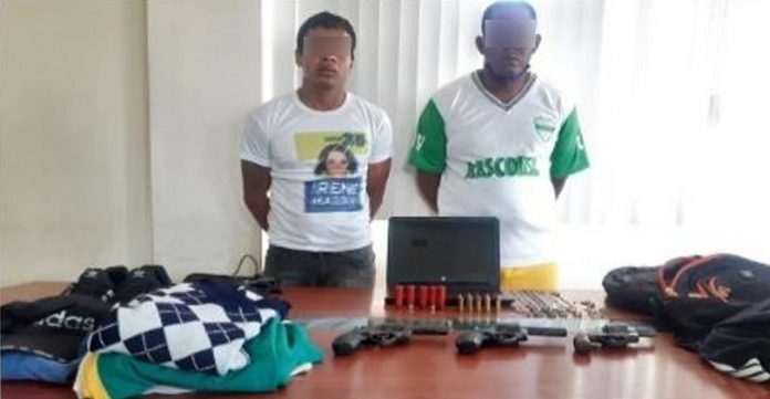 El otro sujeto salió en precipitada carrera y donde metros más adelante arrojó un arma de fuego tipo revolver calibre 38 y una mochila en cuyo interior había cinco cartuchos marca FMSB Ecuador calibre 16 sin percutir, tres cartuchos marca Águila calibre 38 sin percutir al igual que varias prendas de vestir, documentos copias simples de la motocicleta (matricula y revisión), billetera y varios joyas de oro, acero y plata.