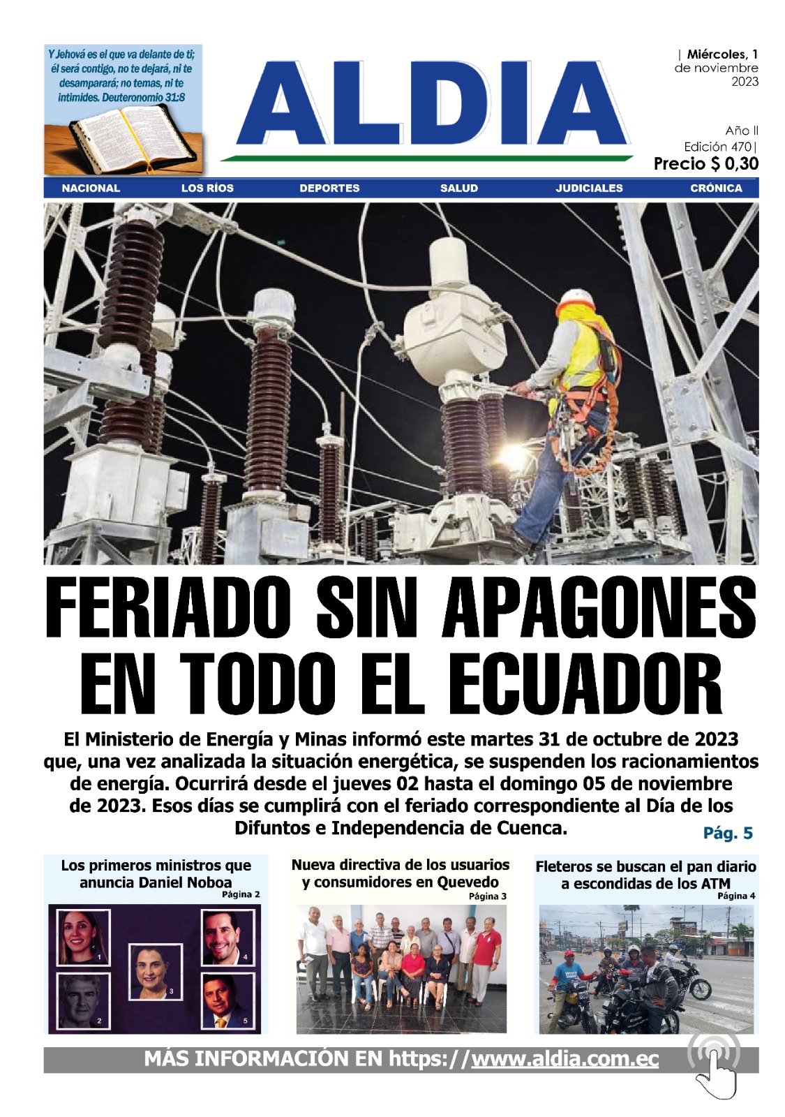 Edición 1 de noviembre de 2023, Feriado sin corte de energía en el Ecuador por: ALDIA 31/10/2023 FacebookTwitterWhatsApp Unirme al canal de whatsapp de noticias ALDIA FacebookTwitterWhatsApp Te recomendamos Ediciones Edición 3 de octubre 2025. Mocache tendrá rodeo montuvio ALDIA - 02/10/2025 Ediciones Edición 29 de septiembre 2025, todo un espetáculo en en la ronda quevedeña ALDIA - 29/09/2025 Ediciones Edición 26 de septiembre 2025, Ronda Quevedeña 2025 ALDIA - 26/09/2025 - Advertisment - LO ÚLTIMO Presidente Noboa entrega ayuda para agricultores del sector agrícola en Babahoyo 17/10/2025 Una persona fue asesinada cerca del puente Los Galleros, en Babahoyo 17/10/2025 Alarma por el dramático aumento de muertes violentas en 2025 en Los Ríos 17/10/2025 Estudiantes exhiben proyectos tecnológicos en Feria de Innovación y Emprendimiento en Quevedo 17/10/2025 Cargar más ÙLTIMAS NOTICIAS Ecuador AME exige pago inmediato de deuda ante imposibilidad de cumplir con pago anticipado del décimo tercer sueldo ALDIA - 06/10/2025 Ecuador Noboa se suma a la marcha en Guayaquil y vuelve a cuestionar a la Corte Constitucional 11/09/2025 Ecuador Noboa amplía el estado de excepción en tres cantones de Cotopaxi y Bolívar 21/08/2025
