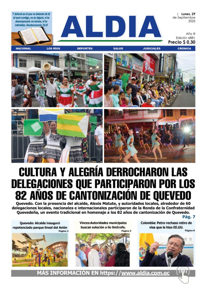 Edición 29 de septiembre 2025, todo un espetáculo en en la ronda quevedeña por: ALDIA 29/09/2025 FacebookTwitterWhatsApp Unirme al canal de whatsapp de noticias ALDIA FacebookTwitterWhatsApp Te recomendamos Ediciones Edición 3 de octubre 2025. Mocache tendrá rodeo montuvio ALDIA - 02/10/2025 Ediciones Edición 26 de septiembre 2025, Ronda Quevedeña 2025 ALDIA - 26/09/2025 Ediciones Edición 24 de sepiembre 2025, el parto se agodiza en el norte de Ecuador ALDIA - 24/09/2025 - Advertisment - LO ÚLTIMO Mocache celebró la Interculturalidad y Plurinacionalidad con gran fiesta montuvia 12/10/2025 Joven asesinado a tiros en el cantón Baba, Los Ríos 12/10/2025 Cuatro babahoyenses murieron en un accidente de tránsito en Yaguachi 11/10/2025 Muere empresario tras 45 días luchando por su vida luego de un ataque armado 10/10/2025 Cargar más ÙLTIMAS NOTICIAS Ecuador AME exige pago inmediato de deuda ante imposibilidad de cumplir con pago anticipado del décimo tercer sueldo ALDIA - 06/10/2025 Ecuador Noboa se suma a la marcha en Guayaquil y vuelve a cuestionar a la Corte Constitucional 11/09/2025 Ecuador Noboa amplía el estado de excepción en tres cantones de Cotopaxi y Bolívar 21/08/2025