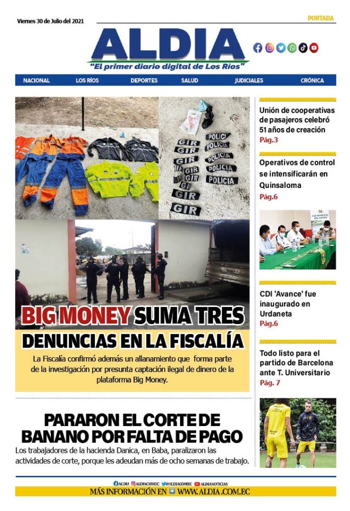 Edición 30 de julio 2021, Trabajadores de bananeras paralizan sus faenas por falta de pago por: ALDIA 29/07/2021 FacebookTwitterWhatsApp Unirme al canal de whatsapp de noticias ALDIA FacebookTwitterWhatsApp Te recomendamos Los Ríos Clínica de diálisis de Quevedo consigue acuerdo con el Gobierno para pago de deuda con bonos ALDIA - 22/10/2025 Los Ríos Hospital Sagrado Corazón de Jesús de Quevedo cuenta con nuevo tomógrafo de alta tecnología ALDIA - 22/10/2025 Los Ríos Movilidad y respeto al espacio público fue tratado por delegados de CTE y Comisaría Municipal de Vinces ALDIA - 22/10/2025 - Advertisment - LO ÚLTIMO Clínica de diálisis de Quevedo consigue acuerdo con el Gobierno para pago de deuda con bonos 22/10/2025 Hospital Sagrado Corazón de Jesús de Quevedo cuenta con nuevo tomógrafo de alta tecnología 22/10/2025 Movilidad y respeto al espacio público fue tratado por delegados de CTE y Comisaría Municipal de Vinces 22/10/2025 IDV dejó escapar el triunfo ante Atlético Mineiro en un empate con sabor a derrota 22/10/2025 Cargar más ÙLTIMAS NOTICIAS Ecuador CNE designa y capacita a 3.345 miembros de Juntas Receptoras del Voto para el referéndum y Consulta Popular 2025 en el exterior ALDIA - 22/10/2025 Ecuador Alcaldías de Imbabura urgen al Gobierno y a indígenas a retomar el diálogo y evitar la confrontación 22/10/2025 Ecuador AME exige pago inmediato de deuda ante imposibilidad de cumplir con pago anticipado del décimo tercer sueldo 06/10/2025