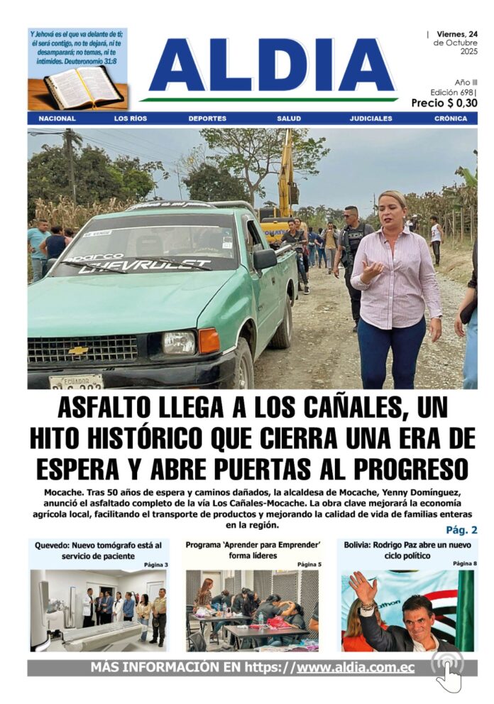 Edición 24 de octubre 2025, Mocache tendrá nueva vía asfaltada Los Cañales por: ALDIA 23/10/2025 FacebookTwitterWhatsApp Unirme al canal de whatsapp de noticias ALDIA FacebookTwitterWhatsApp Te recomendamos Ediciones Edición 29 de octubre 2025, Quevedo presenta problemas de basura con Ingenio ALDIA - 28/10/2025 Ediciones Edición 27 de octubre 2025, Prefectura de Los Ríos realiza plan de desarrollo 2025-2030 ALDIA - 26/10/2025 Ediciones Edición 22 de octubre 2025, Prefectura de Los Ríos lanza plan estratégico 2025 ALDIA - 21/10/2025 - Advertisment - LO ÚLTIMO Edición 29 de octubre 2025, Quevedo presenta problemas de basura con Ingenio 28/10/2025 Con música ranchera despiden a Nelly la dirigente asesinada en Mocache 28/10/2025 Buscan desesperadamente a Jimmy Romero desaparecido en Patricia Pilar, Buena Fe 28/10/2025 Identificados los cuatro asesinados en ataque armado en billar de Santa Ana-Manabí 28/10/2025 Cargar más ÙLTIMAS NOTICIAS Ecuador CNE designa y capacita a 3.345 miembros de Juntas Receptoras del Voto para el referéndum y Consulta Popular 2025 en el exterior ALDIA - 22/10/2025 Ecuador Alcaldías de Imbabura urgen al Gobierno y a indígenas a retomar el diálogo y evitar la confrontación 22/10/2025 Ecuador AME exige pago inmediato de deuda ante imposibilidad de cumplir con pago anticipado del décimo tercer sueldo 06/10/2025