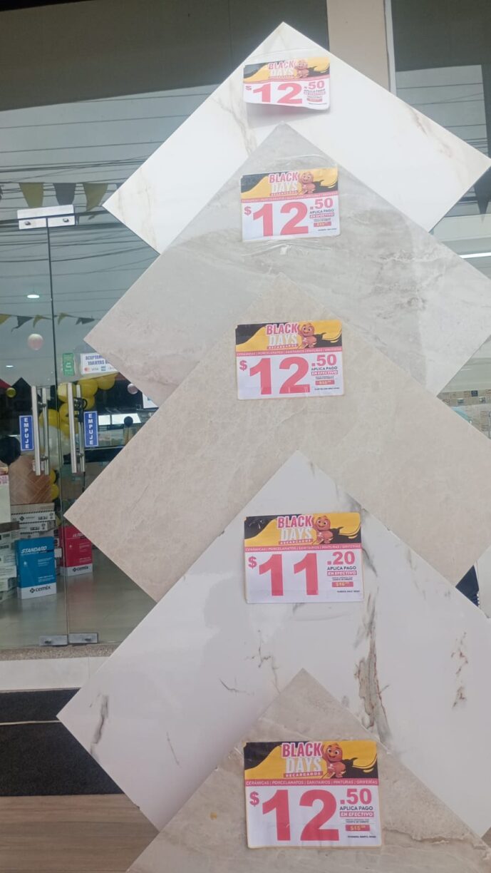 “Tenemos descuentos en toda la línea de productos, pero especialmente en nuestros artículos estrella: cerámicas y porcelanatos. También ofrecemos fregaderos, planchas de granito, sanitarios y todo tipo de acabados de la construcción. Además, también tenemos nuestro pegante Finix, fabricado y comercializado directamente por Innova Centro Cerámico”, explicó Milton López, encargado de comunicación y comercialización de la empresa.