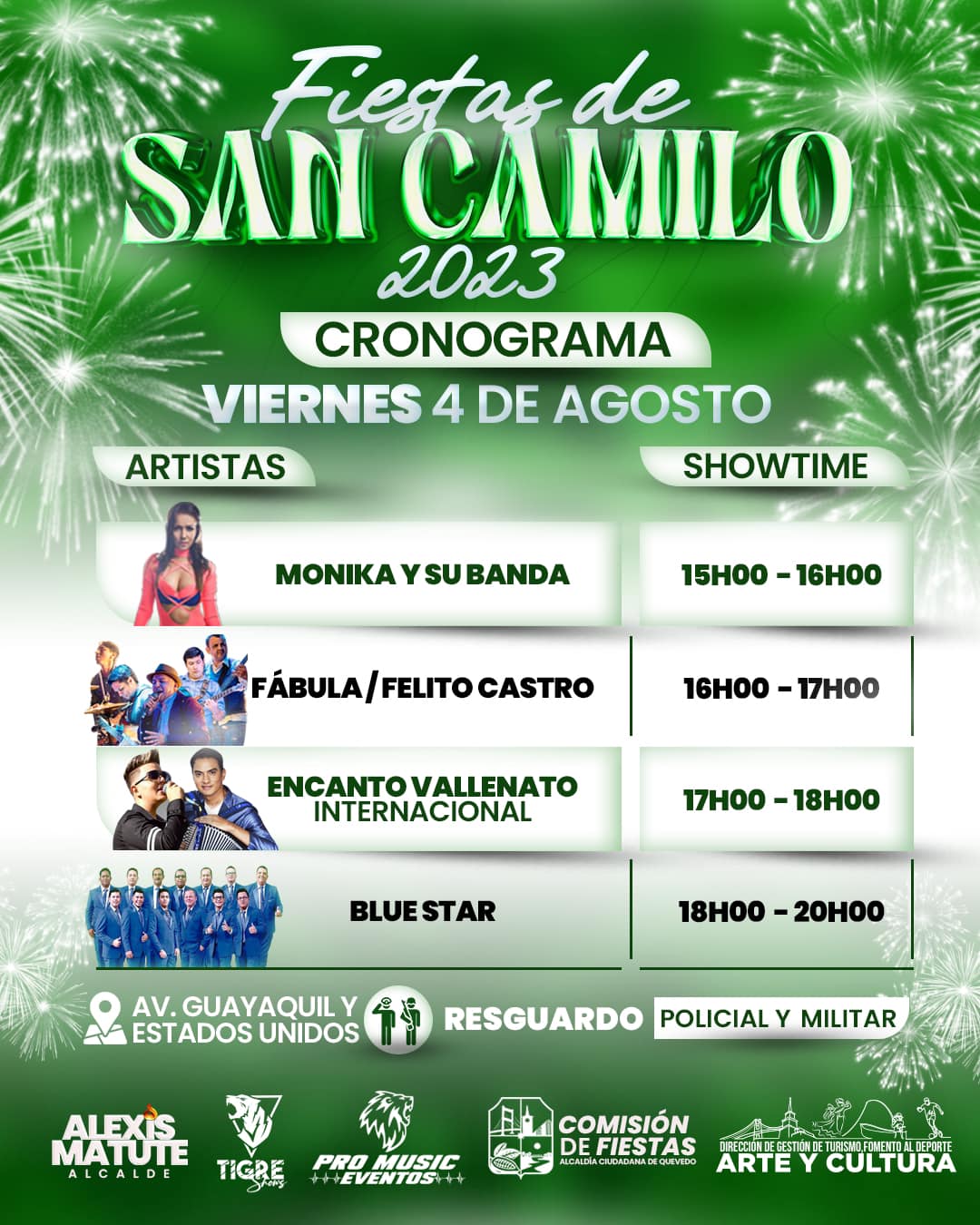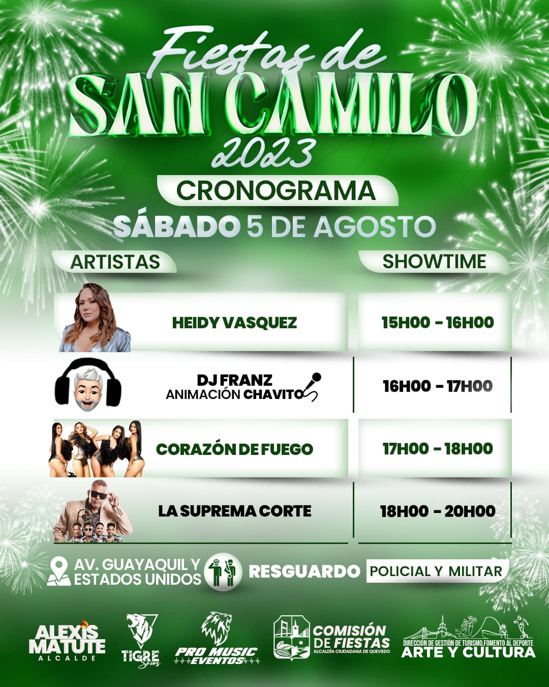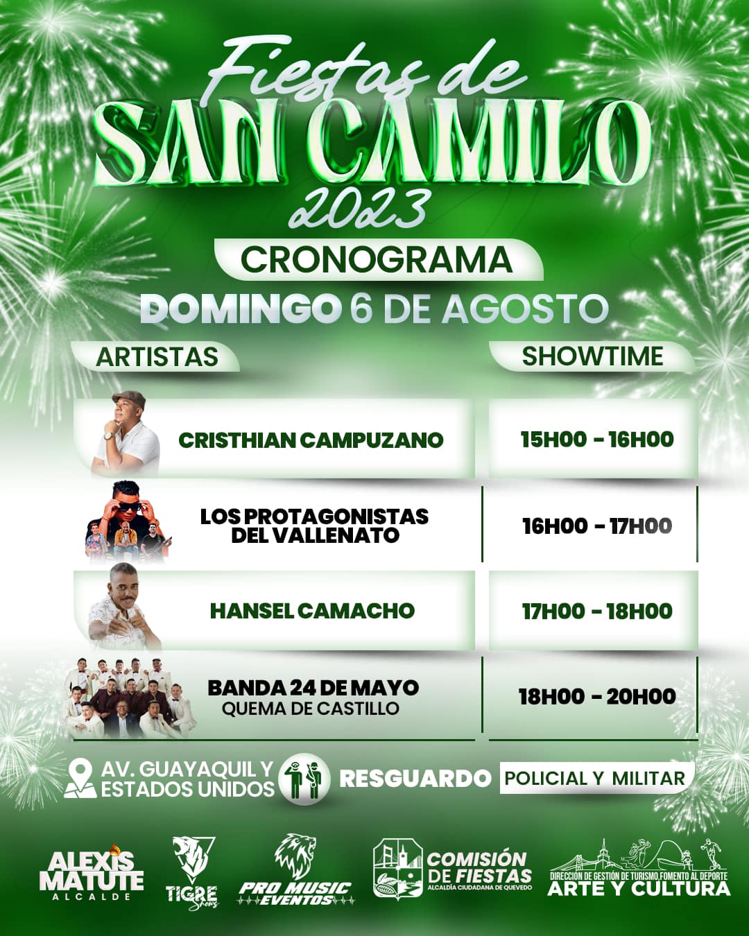Esta empresa (Pro Music Eventos) sería una de las auspiciantes de los conciertos realizados el pasado 4, 5 y 6 de agosto de 2023 por las fiestas patronales de la parroquia San Camilo. Según el concejal y presidente de la Comisión de Fiestas, Jimmy Aguirre, la cartelera musical fue una gestión municipal del alcalde Alexis Matute, la Comisión que dirige y apoyo de empresarios privados, quienes hicieron «un gran aporte». «Los recursos los hemos conseguido desde afuera, ni siquiera son recursos del GAD», dejó en claro el concejal Aguirre durante la presentación de la cartelera musical para las fiestas de San Camilo, el pasado 19 de julio de 2023, mediante rueda de prensa en el salón Simón Bolívar de la Ciudadela Municipal.
