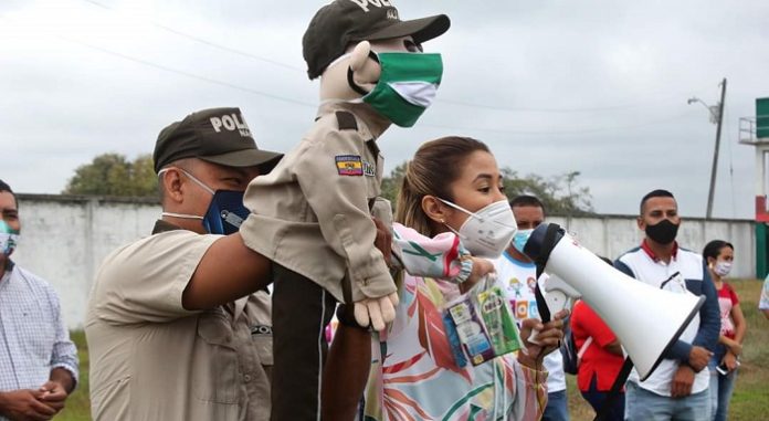 Paquito Policía fue la sorpresa para decenas de niños del cantón que acudieron al estadio de la localidad. Con su mascarilla facial invitaba a los pequeños presentes a ponerse un cubre bocas y a lavarse las manos.