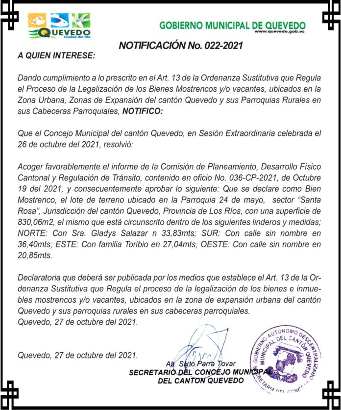 NOTIFICACION NO. 022-2021 GAD MUNICIPAL DE QUEVEDO 19/11/2021 Únete a nuestro canal FacebookInstagramTikTokTwitterWhatsApp Notificaciones Lo último Quevedo Clínica Móvil del GAD-Quevedo lleva salud preventiva al Sector Juan de Dios Avilés Zárate Los Ríos Ecuador concreta la primera exportación de plátano con Sello AFC hacia Chile Los Ríos Prefectura de Los Ríos celebró la Navidad a 800 adultos mayores en la UTEQ Crónica Fiscalía de Los Ríos allanada por presunta filtración de datos a red de sicariato Suscribirte - Obtenga acceso completo a nuestro contenido premium - No te pierdas ninguna historia con las notificaciones. SuscribirmeHe leído y acepto la Política de Privacidad. - Browse free from up to 5 devices at once