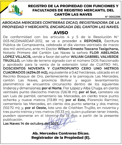 REGISTRO DE LA PROPIEDAD CON FUNCIONES Y FACULTADES DE REGISTRO MERCANTIL DEL CANTÓN LAS NAVES N° 0002298 por: ALDIA 24/10/2025 FacebookTwitterWhatsApp Unirme al canal de whatsapp de noticias ALDIA FacebookTwitterWhatsApp Te recomendamos Notificaciones REGISTRO DE LA PROPIEDAD CON FUNCIONES Y FACULTADES DE REGISTRO MERCANTIL DEL CANTÓN LAS NAVES N° 0002297 ALDIA - 24/10/2025 Notificaciones REGISTRO DE LA PROPIEDAD CON FUNCIONES Y FACULTADES DE REGISTRO MERCANTIL DEL CANTÓN LAS NAVES N° 0002314 ALDIA - 24/10/2025 Notificaciones REGISTRO DE LA PROPIEDAD CON FUNCIONES Y FACULTADES DE REGISTRO MERCANTIL DEL CANTÓN LAS NAVES N° 0002299 ALDIA - 24/10/2025 - Advertisment - LO ÚLTIMO Te explicamos el problema entre el Municipio de Quevedo e Ingenio con la recolección de basura 27/10/2025 1.029 crímenes registrados entre enero y octubre, en Los Ríos, la segunda provincia con más muertes violentas 27/10/2025 La Dirección de Mercados Municipales impulsa el emprendimiento y el bienestar con una exitosa feria de alimentos saludables en Quevedo 27/10/2025 Mocache: Entrega de 38.000 plantas de plátano Hartón genera progreso agrícola 27/10/2025 Cargar más ÙLTIMAS NOTICIAS Ecuador CNE designa y capacita a 3.345 miembros de Juntas Receptoras del Voto para el referéndum y Consulta Popular 2025 en el exterior ALDIA - 22/10/2025 Ecuador Alcaldías de Imbabura urgen al Gobierno y a indígenas a retomar el diálogo y evitar la confrontación 22/10/2025 Ecuador AME exige pago inmediato de deuda ante imposibilidad de cumplir con pago anticipado del décimo tercer sueldo 06/10/2025