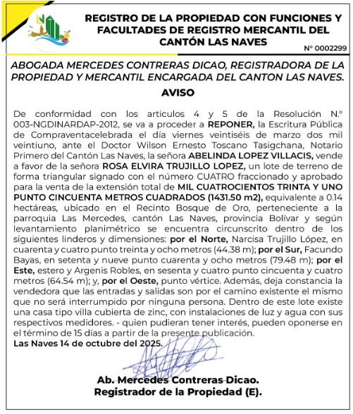 REGISTRO DE LA PROPIEDAD CON FUNCIONES Y FACULTADES DE REGISTRO MERCANTIL DEL CANTÓN LAS NAVES N° 0002299 por: ALDIA 24/10/2025 FacebookTwitterWhatsApp Unirme al canal de whatsapp de noticias ALDIA FacebookTwitterWhatsApp Te recomendamos Notificaciones REGISTRO DE LA PROPIEDAD CON FUNCIONES Y FACULTADES DE REGISTRO MERCANTIL DEL CANTÓN LAS NAVES N° 0002297 ALDIA - 24/10/2025 Notificaciones REGISTRO DE LA PROPIEDAD CON FUNCIONES Y FACULTADES DE REGISTRO MERCANTIL DEL CANTÓN LAS NAVES N° 0002314 ALDIA - 24/10/2025 Notificaciones REGISTRO DE LA PROPIEDAD CON FUNCIONES Y FACULTADES DE REGISTRO MERCANTIL DEL CANTÓN LAS NAVES N° 0002298 ALDIA - 24/10/2025 - Advertisment - LO ÚLTIMO Te explicamos el problema entre el Municipio de Quevedo e Ingenio con la recolección de basura 27/10/2025 1.029 crímenes registrados entre enero y octubre, en Los Ríos, la segunda provincia con más muertes violentas 27/10/2025 La Dirección de Mercados Municipales impulsa el emprendimiento y el bienestar con una exitosa feria de alimentos saludables en Quevedo 27/10/2025 Mocache: Entrega de 38.000 plantas de plátano Hartón genera progreso agrícola 27/10/2025 Cargar más ÙLTIMAS NOTICIAS Ecuador CNE designa y capacita a 3.345 miembros de Juntas Receptoras del Voto para el referéndum y Consulta Popular 2025 en el exterior ALDIA - 22/10/2025 Ecuador Alcaldías de Imbabura urgen al Gobierno y a indígenas a retomar el diálogo y evitar la confrontación 22/10/2025 Ecuador AME exige pago inmediato de deuda ante imposibilidad de cumplir con pago anticipado del décimo tercer sueldo 06/10/2025