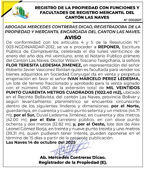 REGISTRO DE LA PROPIEDAD CON FUNCIONES Y FACULTADES DE REGISTRO MERCANTIL DEL CANTÓN LAS NAVES N° 0002507 por: ALDIA 29/10/2025 FacebookTwitterWhatsApp Unirme al canal de whatsapp de noticias ALDIA FacebookTwitterWhatsApp Te recomendamos Notificaciones REGISTRO DE LA PROPIEDAD CON FUNCIONES Y FACULTADES DE REGISTRO MERCANTIL DEL CANTÓN LAS NAVES N° 0002507 ALDIA - 30/10/2025 Notificaciones COMUNICADO OFICIAL – EMPRESA PÚBLICA MUNICIPAL DE AGUA POTABLE Y ALCANTARILLADO DEL CANTÓN QUEVEDO – EPMAPAQ ALDIA - 29/10/2025 Notificaciones COMUNICADO OFICIAL – EMPRESA PÚBLICA MUNICIPAL DE AGUA POTABLE Y ALCANTARILLADO DEL CANTÓN QUEVEDO – EPMAPAQ ALDIA - 29/10/2025 - Advertisment - LO ÚLTIMO «No hay nada mágico», dice el CNE sobre pedido del correísmo 31/10/2025 Los Ríos refuerza seguridad por feriado con despliegue de 2.124 Policías 31/10/2025 Prohibidas las «Rodadas» en Los Ríos por Seguridad Ciudadana 31/10/2025 El estadio ‘Oscar Llerena’ será repotenciado, eso se aprobó durante la Sesión de Consejo provincial 31/10/2025 Cargar más ÙLTIMAS NOTICIAS Ecuador CNE designa y capacita a 3.345 miembros de Juntas Receptoras del Voto para el referéndum y Consulta Popular 2025 en el exterior ALDIA - 22/10/2025 Ecuador Alcaldías de Imbabura urgen al Gobierno y a indígenas a retomar el diálogo y evitar la confrontación 22/10/2025 Ecuador AME exige pago inmediato de deuda ante imposibilidad de cumplir con pago anticipado del décimo tercer sueldo 06/10/2025