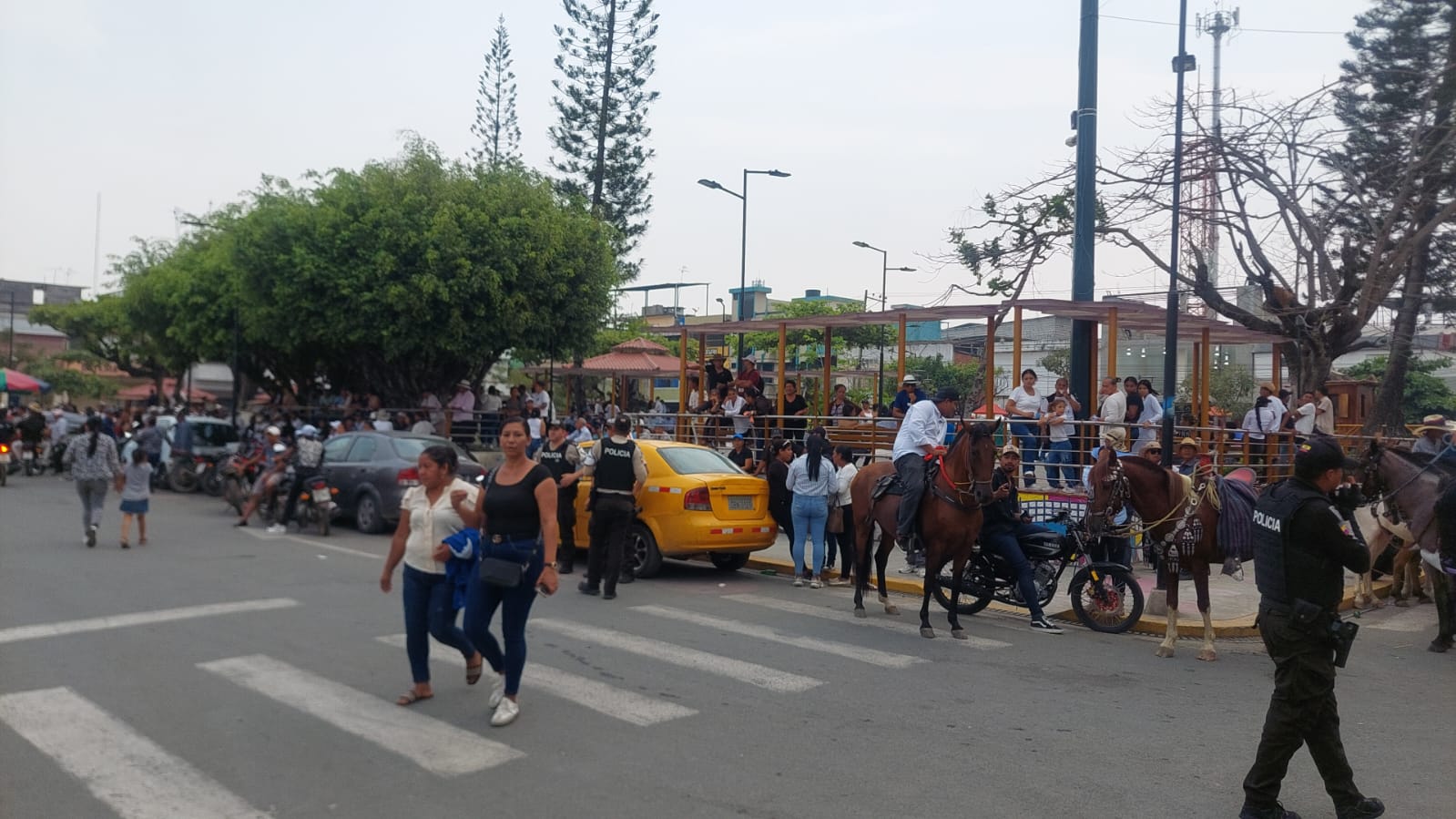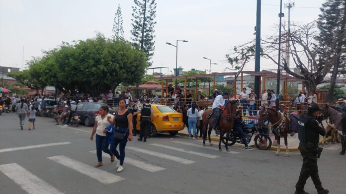La ceremonia fúnebre acompañaba a los féretros de los conocidos empresarios, Nacho Jiménez y Viche Ronquillo. El cortejo, que incluía una caravana de caballistas, recorría las principales calles del cantón.