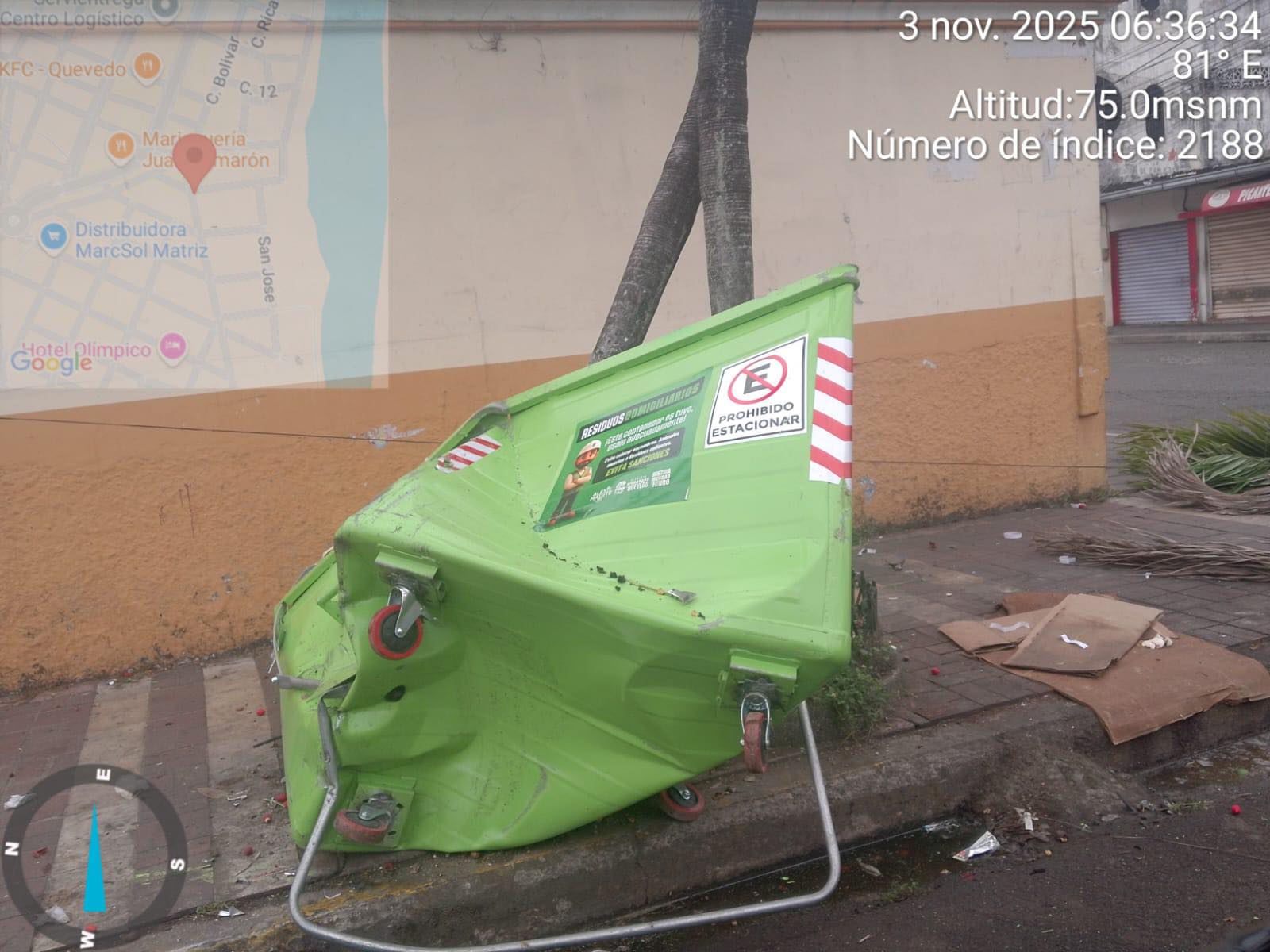 Sin embargo, apenas dos días después de ser ubicados, uno de estos contenedores apareció totalmente destruido en la avenida Jaime Roldós Aguilera, en la esquina de la Escuela América, centro de Quevedo. La situación llamó la atención del alcalde de la ciudad, Alexis Matute, quien expresó su preocupación.
